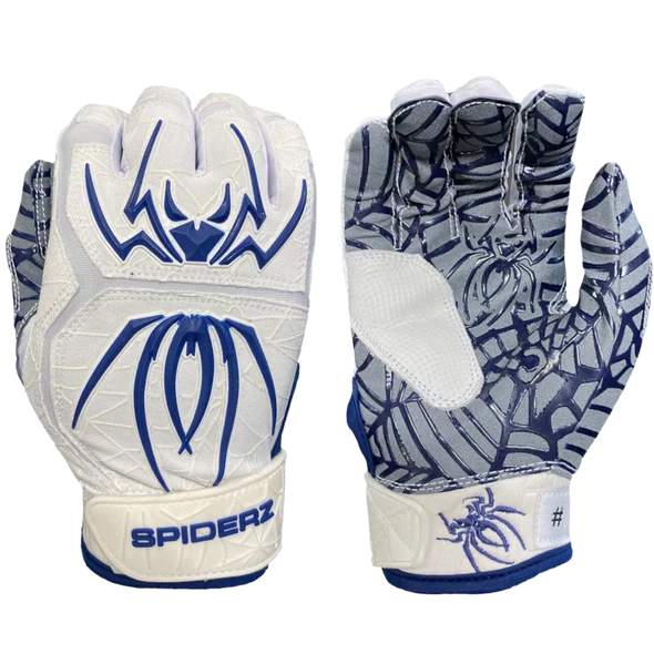 These 2022 Spiderz HYBRID Batting Gloves: White/Navy models are available from Youth Medium to Adult 2XL and ships fast and free right here at headbangersports.com!